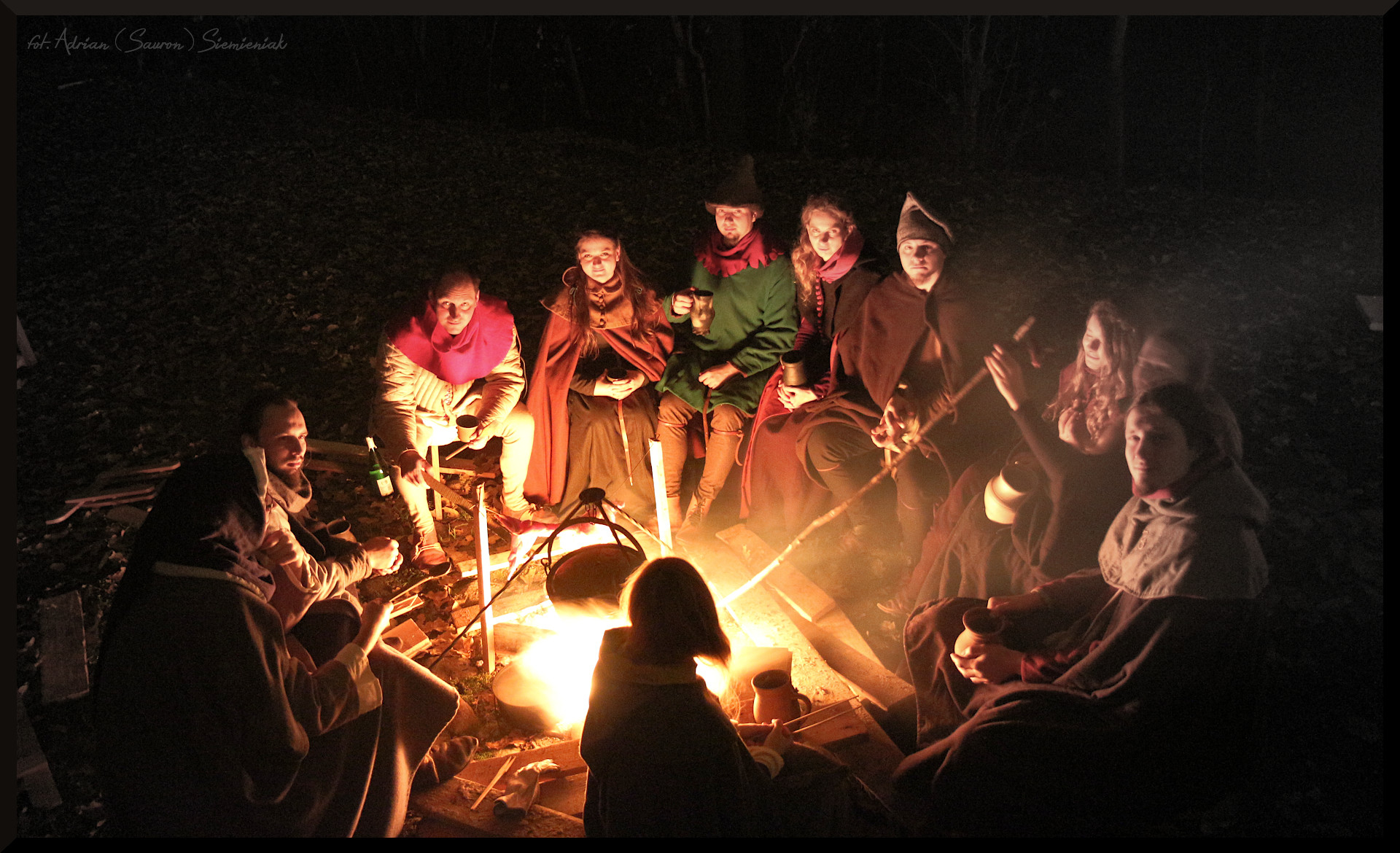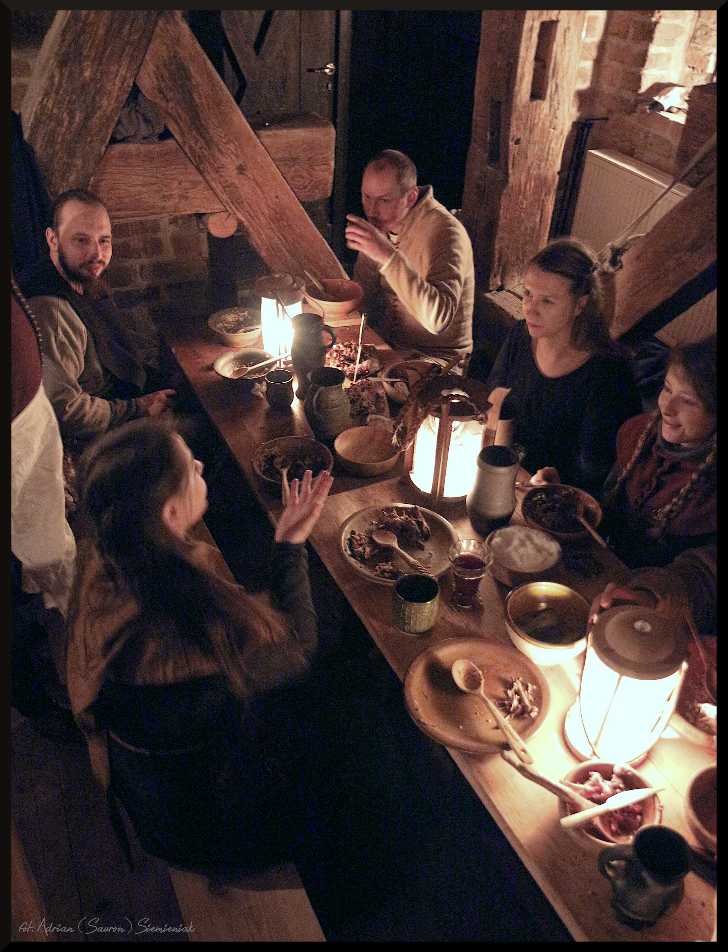 Na początku, po przebieżce leśnej, chętni mogli nauczyć się oprawiać i przygotować królika. Później gotowaliśmy i piekliśmy mięsiwa na dziedzińcu, by następnie wspólnie biesiadować na zamku do wczesnych godzin porannych (choć jeszcze nie białego świtu – o tej porze roku było by to dość męczące przedsięwzięcie). Piliśmy wspólnie przygotowany cydr, miód i klarety. Była potrawka z królika z kaszą, królik pieczony, polskie oliwki, marmolada ze świni i cała masa korzenno-ziołowych przekąsek. Graliśmy w hazardowe gry średniowieczne, które niestety pokazały, jak fortuna bywa niesprawiedliwa – emocji było dużo, każdy grosz (a właściwie półgrosz Siemowita) się liczył!