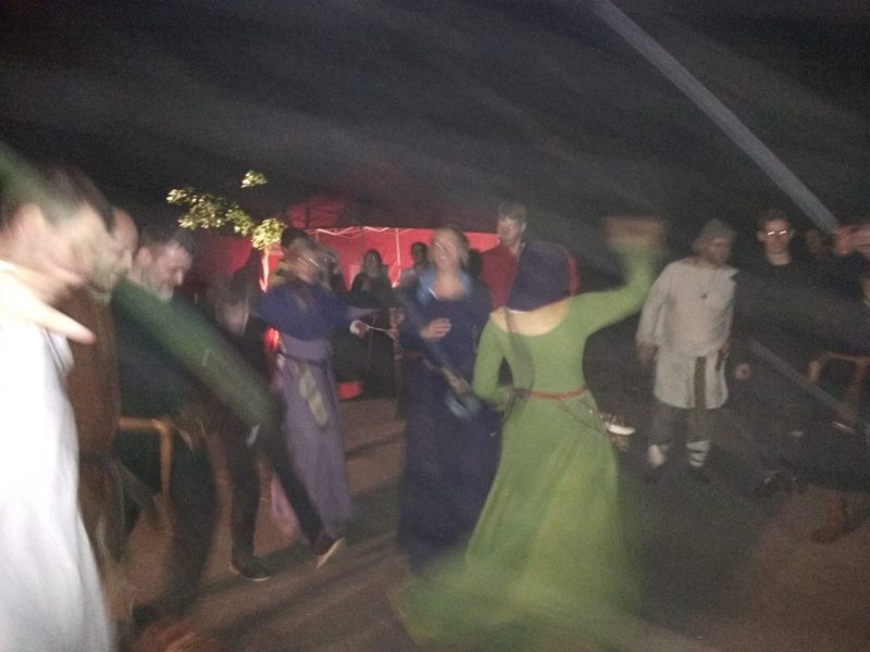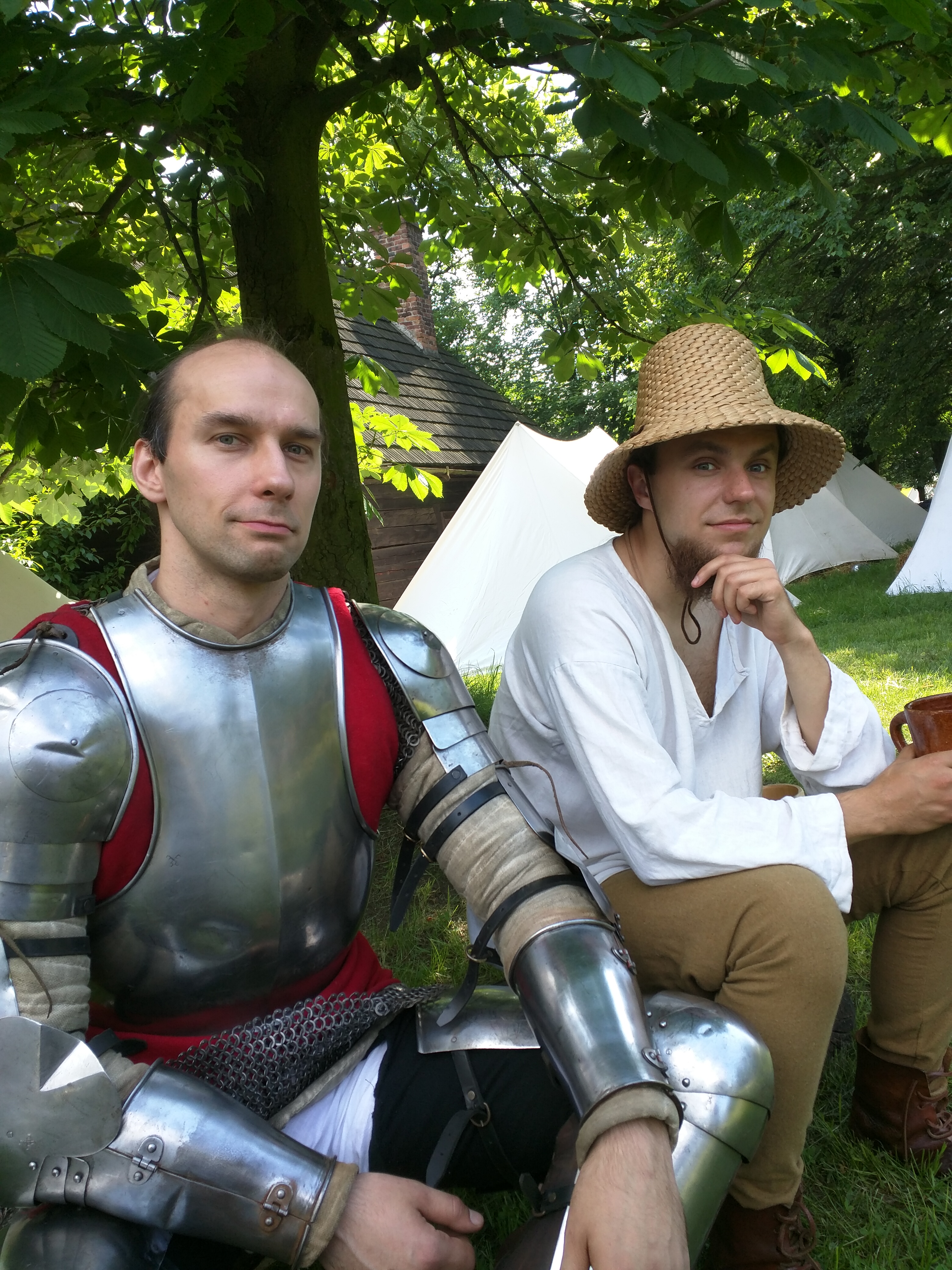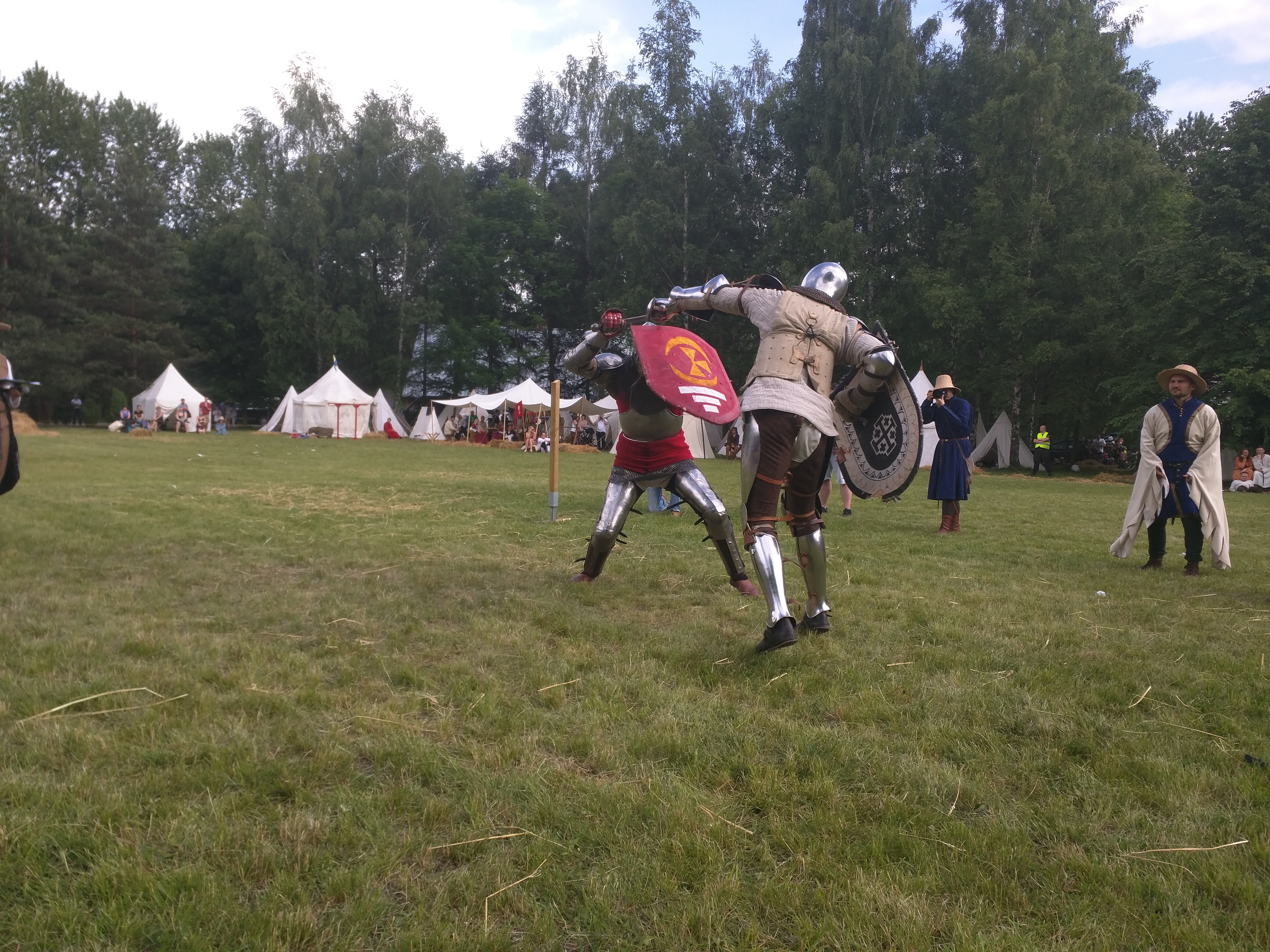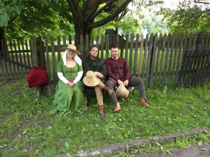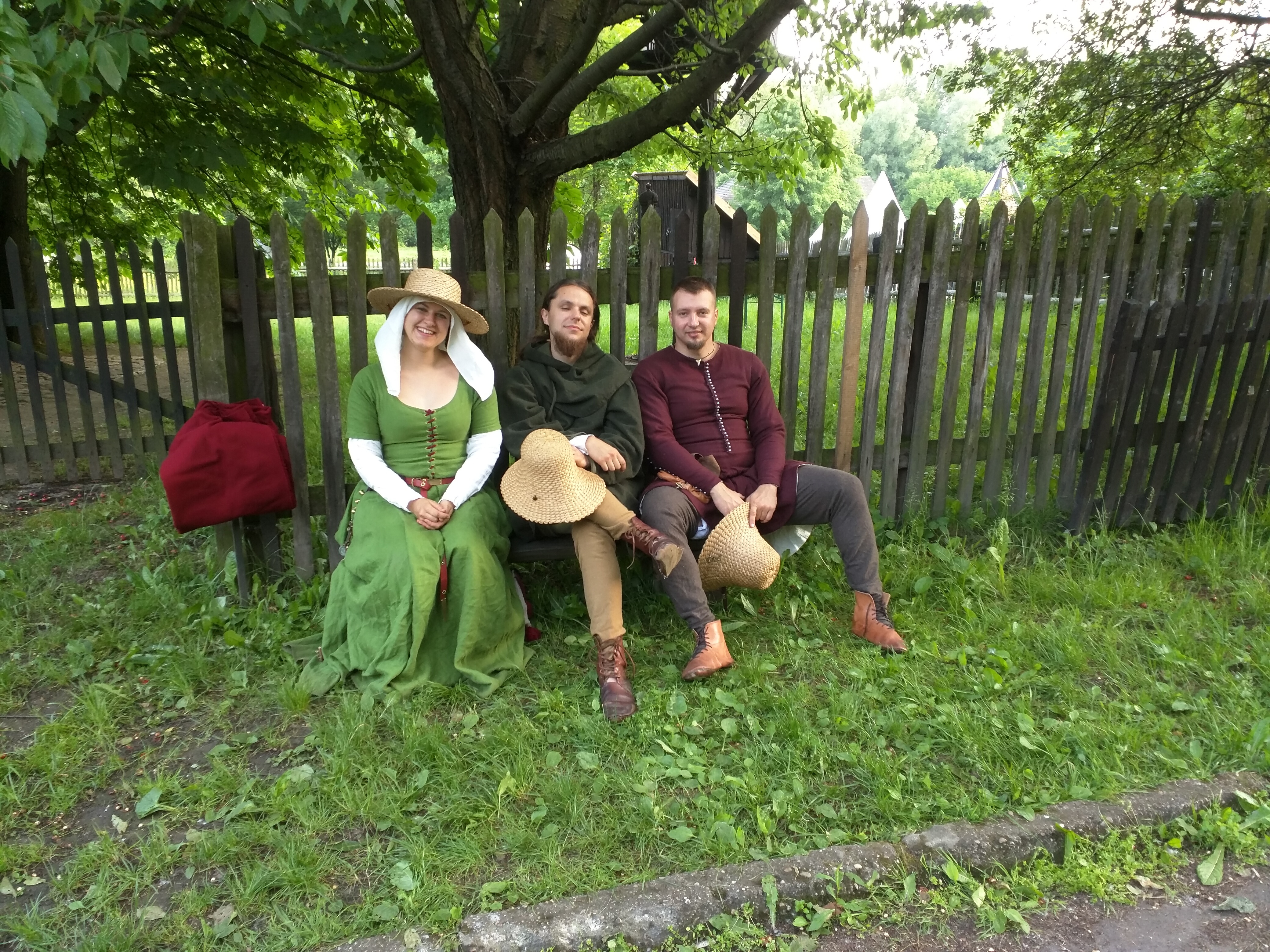 Słoneczko prażyło, publika dopisała, wiwatom i zdjęciom nie było końca. Po powrocie do skansenu (swoją drogą bardzo urokliwego) buszowaliśmy w trawach, zagrodach i chatach opracowując taktykę naszego reprezentanta w turnieju miecza i tarczy… no dobra tak naprawdę to drzemaliśmy, a Bartek się szykował do turnieju :). Co do samego turnieju, to cóż dwóch Panów wchodziło w szranki, tłukło się metalem po głowach następnie jeden wychodził z tarczą, a drugi no cóż… taki mamy klimat :). Bartek dzięki dopingowi tysięcy wężowych gardeł (czytaj: siedmiu) wracał zawsze z tarczą, skutkiem czego dostał się do finału, który miał się odbyć w niedziele. Tym sposobem wiedzieliśmy już co będziemy robić przez resztę dnia, wieczoru, nocy… świętowaliśmy 🙂 Nasi przyjaciele ,którzy zorganizowali turniej postarali się o oprawę muzyczną i tak przy dźwiękach fletów, lutni, bębenków i dud tańcowaliśmy pod sceną a nawet i na scenie do późnych godzin wieczornych. Gdy cały program taneczno-artystyczny dobiegł końca, przenieśliśmy się do ogniska gdzie przy dźwiękach pseudo lutni śpiewaliśmy i wesoło trzodziliśmy do rana! Skutkiem czego poranek niedzielny nie był wcale lepszy od sobotniego, ale w końcu jesteśmy profesjonalistami :).