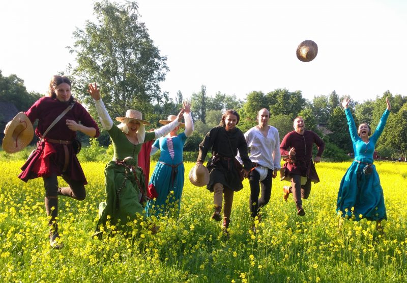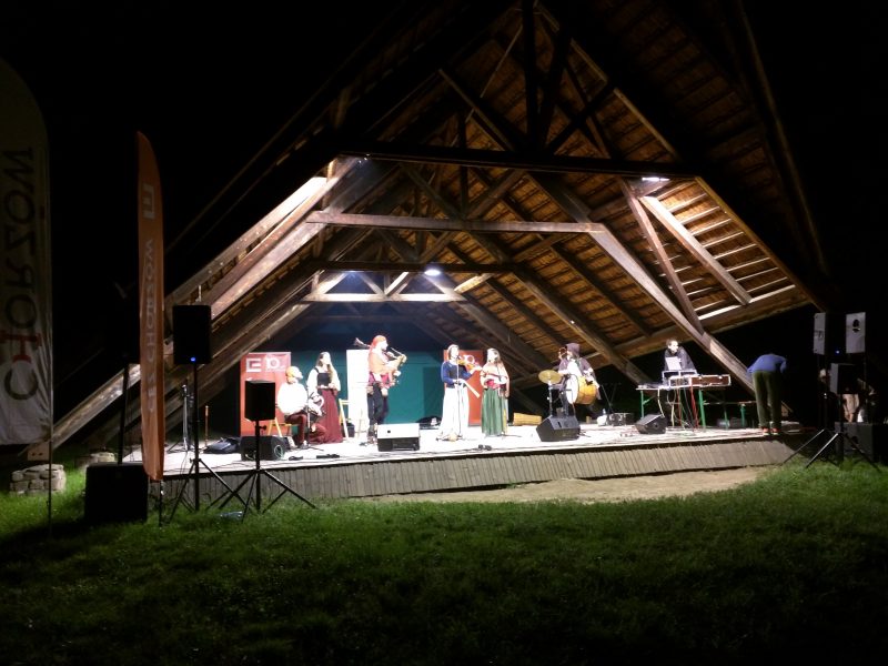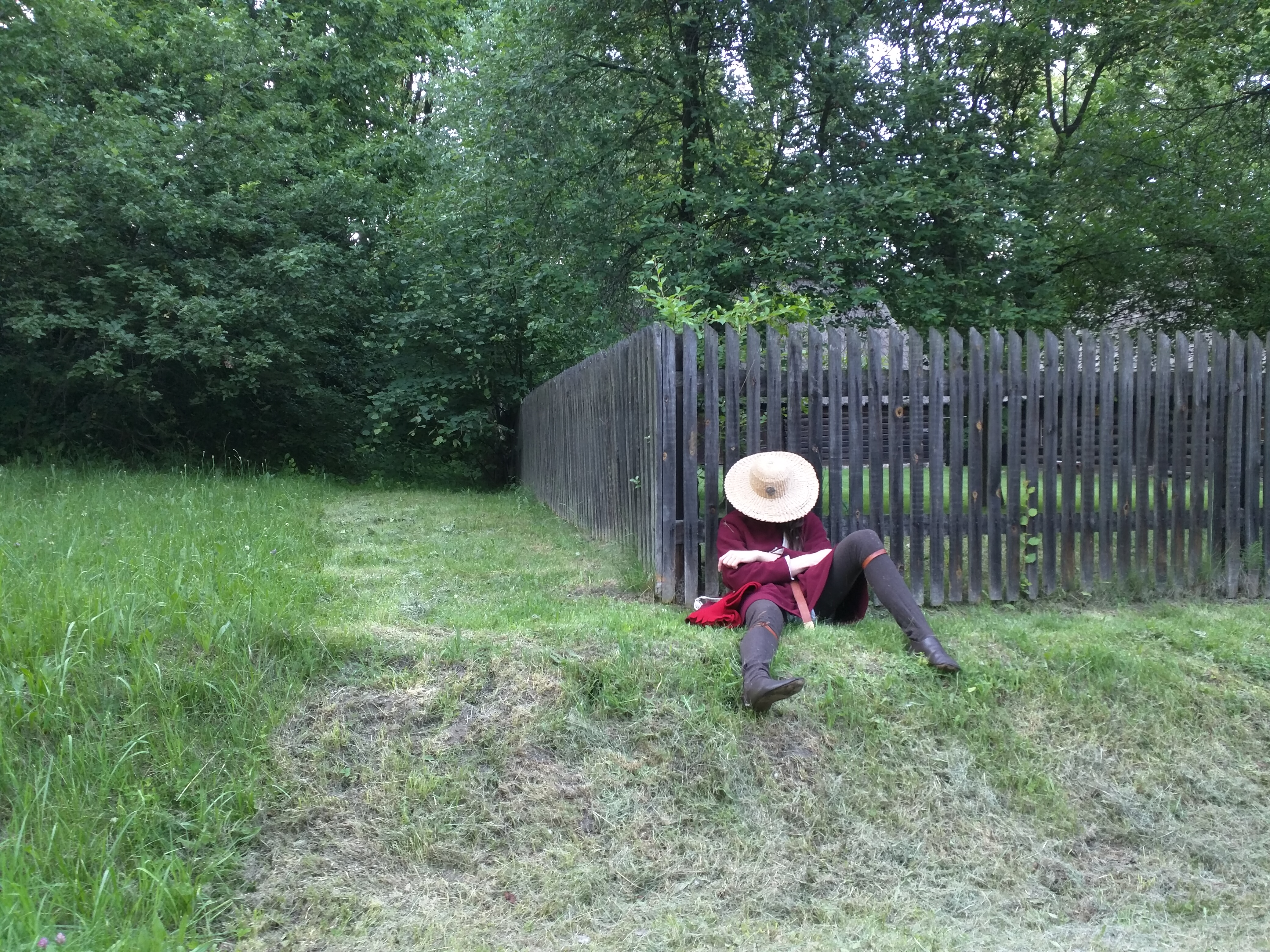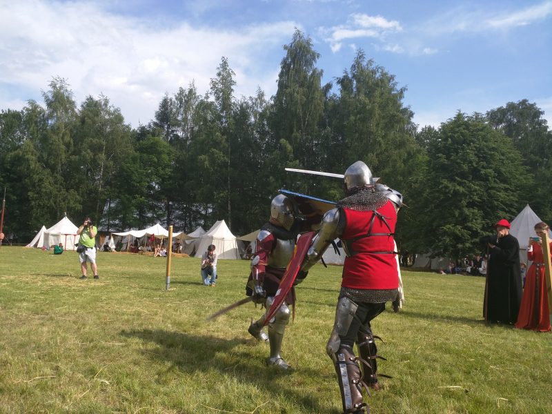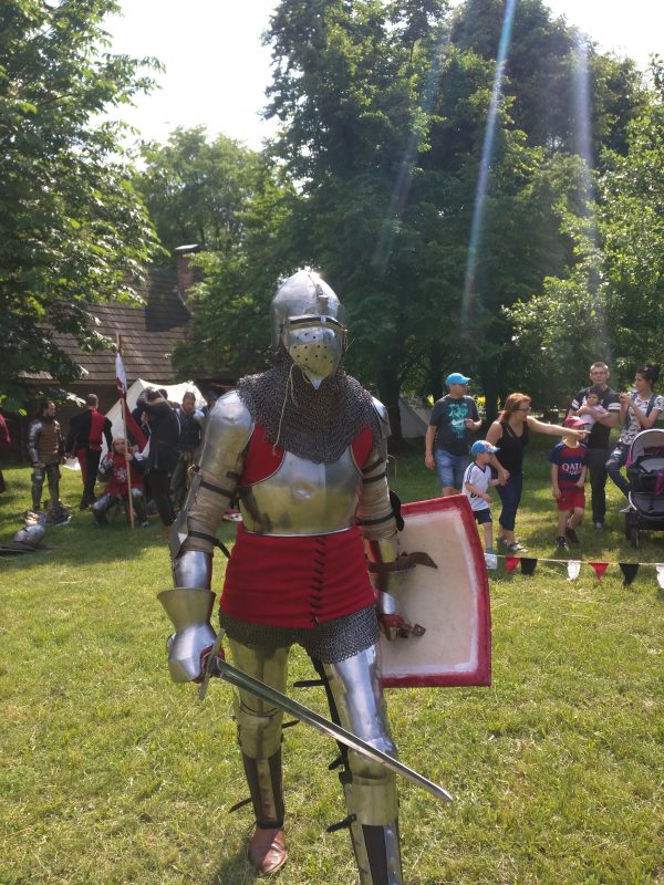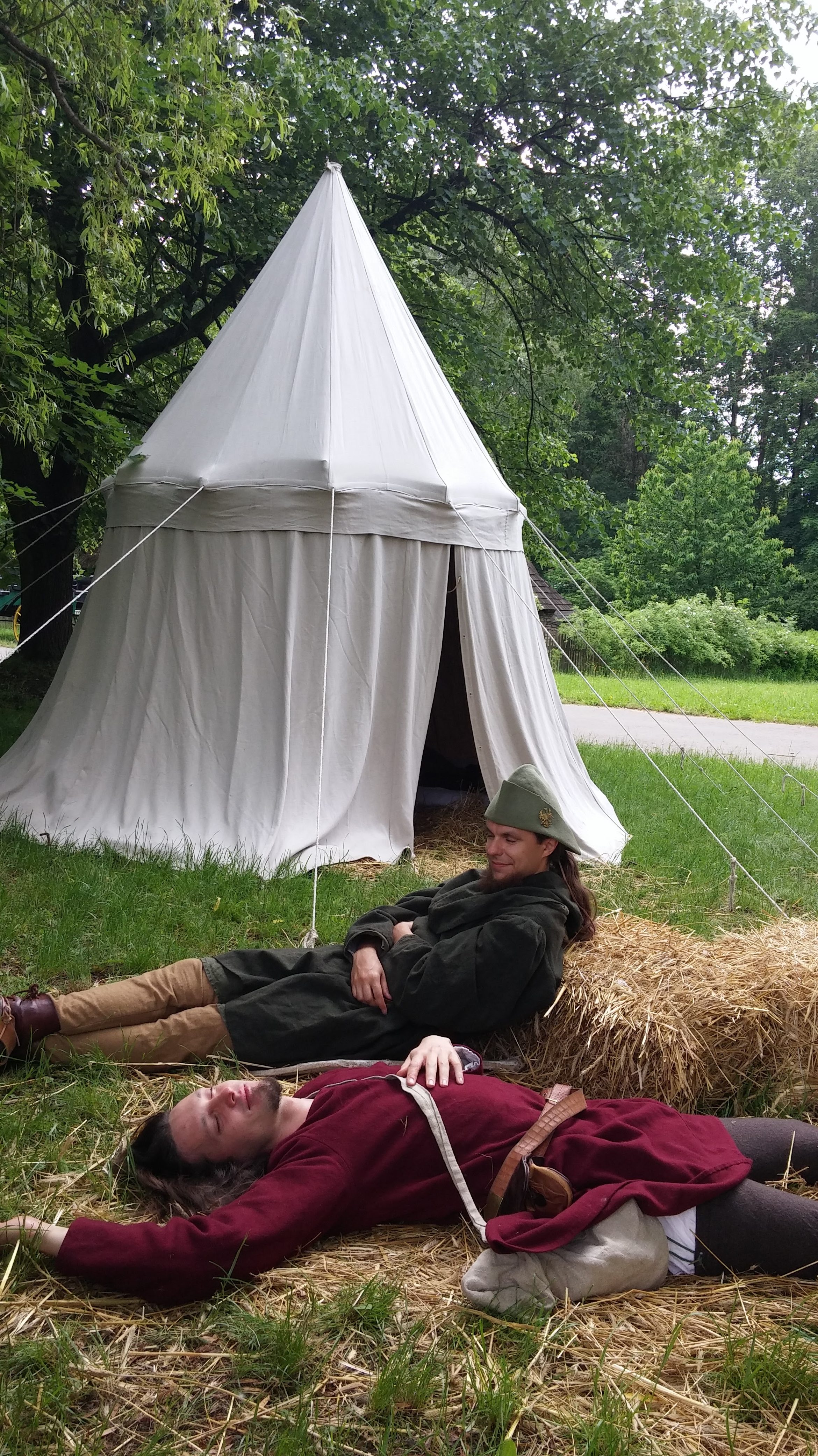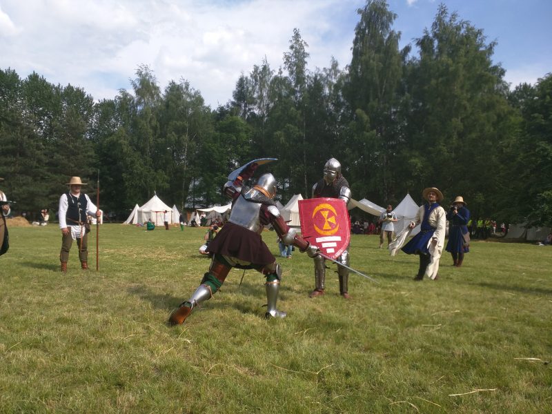 Słoneczko prażyło, publika dopisała, wiwatom i zdjęciom nie było końca. Po powrocie do skansenu (swoją drogą bardzo urokliwego) buszowaliśmy w trawach, zagrodach i chatach opracowując taktykę naszego reprezentanta w turnieju miecza i tarczy… no dobra tak naprawdę to drzemaliśmy, a Bartek się szykował do turnieju :). Co do samego turnieju, to cóż dwóch Panów wchodziło w szranki, tłukło się metalem po głowach następnie jeden wychodził z tarczą, a drugi no cóż… taki mamy klimat :). Bartek dzięki dopingowi tysięcy wężowych gardeł (czytaj: siedmiu) wracał zawsze z tarczą, skutkiem czego dostał się do finału, który miał się odbyć w niedziele. Tym sposobem wiedzieliśmy już co będziemy robić przez resztę dnia, wieczoru, nocy… świętowaliśmy 🙂 Nasi przyjaciele ,którzy zorganizowali turniej postarali się o oprawę muzyczną i tak przy dźwiękach fletów, lutni, bębenków i dud tańcowaliśmy pod sceną a nawet i na scenie do późnych godzin wieczornych. Gdy cały program taneczno-artystyczny dobiegł końca, przenieśliśmy się do ogniska gdzie przy dźwiękach pseudo lutni śpiewaliśmy i wesoło trzodziliśmy do rana! Skutkiem czego poranek niedzielny nie był wcale lepszy od sobotniego, ale w końcu jesteśmy profesjonalistami :).