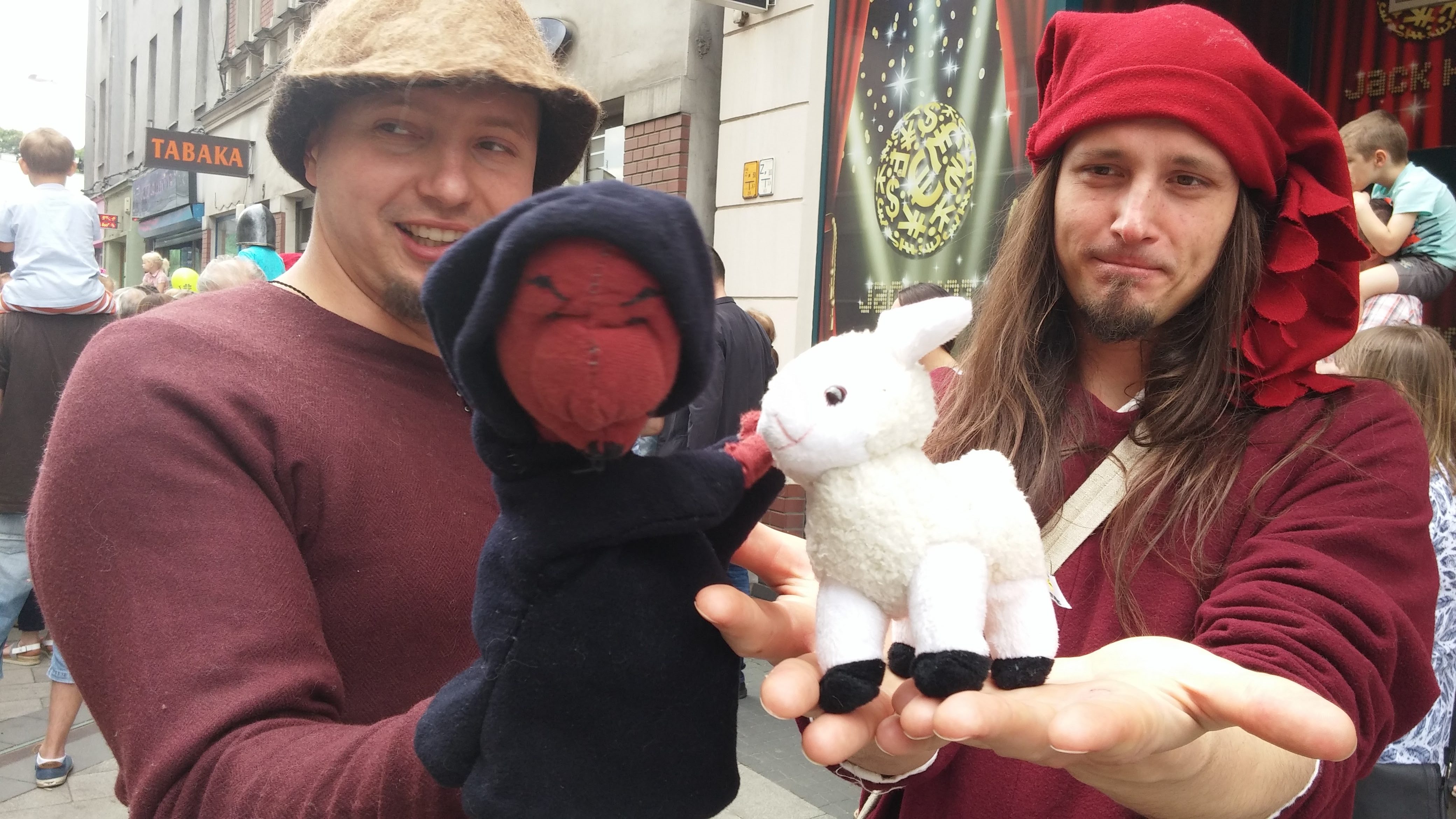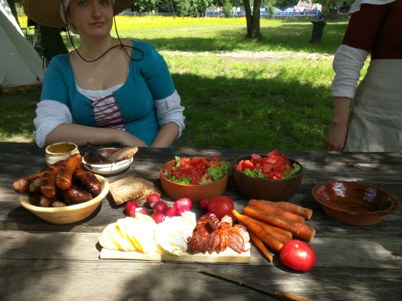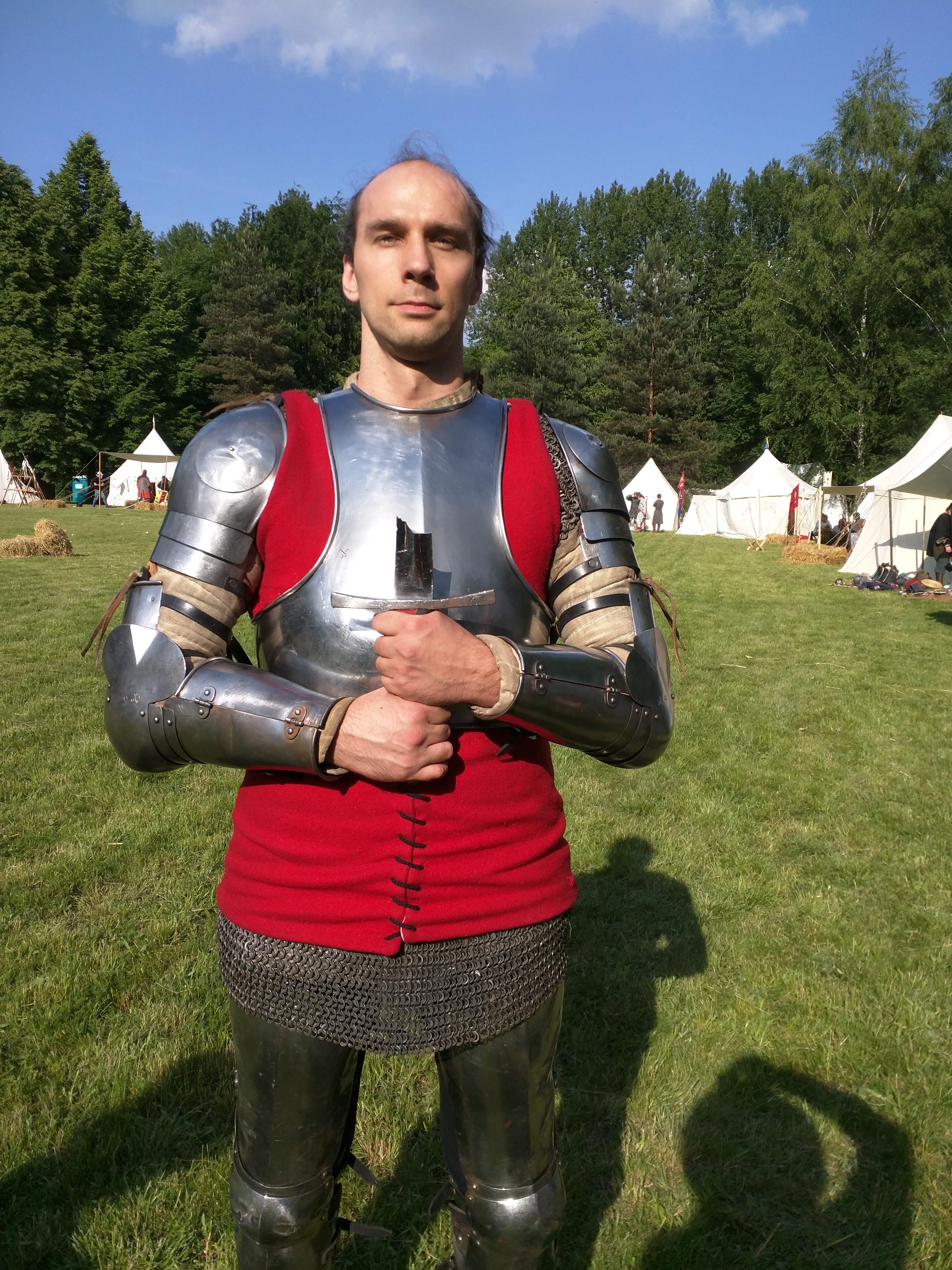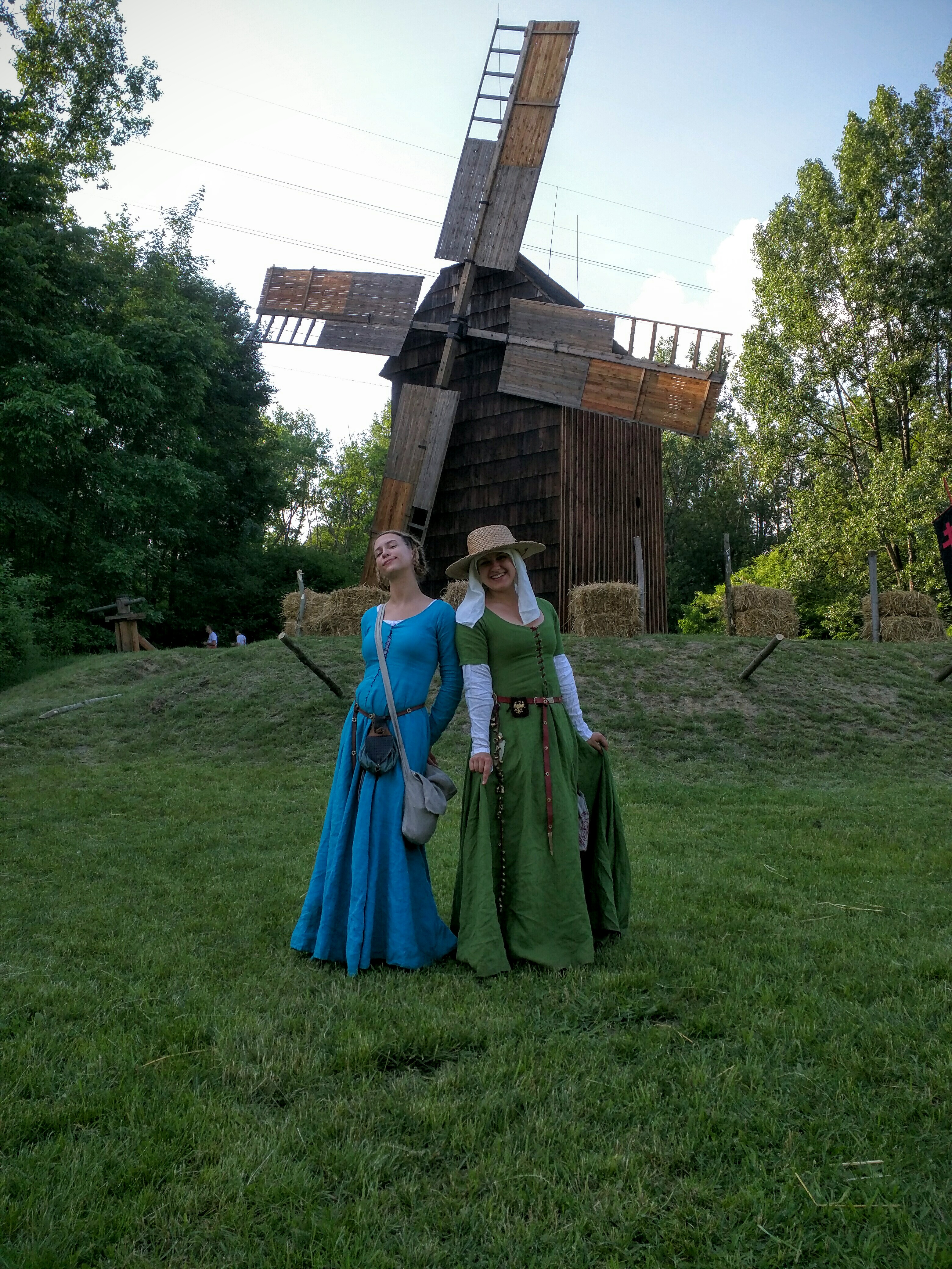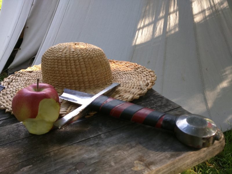 Słoneczko prażyło, publika dopisała, wiwatom i zdjęciom nie było końca. Po powrocie do skansenu (swoją drogą bardzo urokliwego) buszowaliśmy w trawach, zagrodach i chatach opracowując taktykę naszego reprezentanta w turnieju miecza i tarczy… no dobra tak naprawdę to drzemaliśmy, a Bartek się szykował do turnieju :). Co do samego turnieju, to cóż dwóch Panów wchodziło w szranki, tłukło się metalem po głowach następnie jeden wychodził z tarczą, a drugi no cóż… taki mamy klimat :). Bartek dzięki dopingowi tysięcy wężowych gardeł (czytaj: siedmiu) wracał zawsze z tarczą, skutkiem czego dostał się do finału, który miał się odbyć w niedziele. Tym sposobem wiedzieliśmy już co będziemy robić przez resztę dnia, wieczoru, nocy… świętowaliśmy 🙂 Nasi przyjaciele ,którzy zorganizowali turniej postarali się o oprawę muzyczną i tak przy dźwiękach fletów, lutni, bębenków i dud tańcowaliśmy pod sceną a nawet i na scenie do późnych godzin wieczornych. Gdy cały program taneczno-artystyczny dobiegł końca, przenieśliśmy się do ogniska gdzie przy dźwiękach pseudo lutni śpiewaliśmy i wesoło trzodziliśmy do rana! Skutkiem czego poranek niedzielny nie był wcale lepszy od sobotniego, ale w końcu jesteśmy profesjonalistami :).