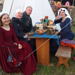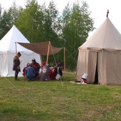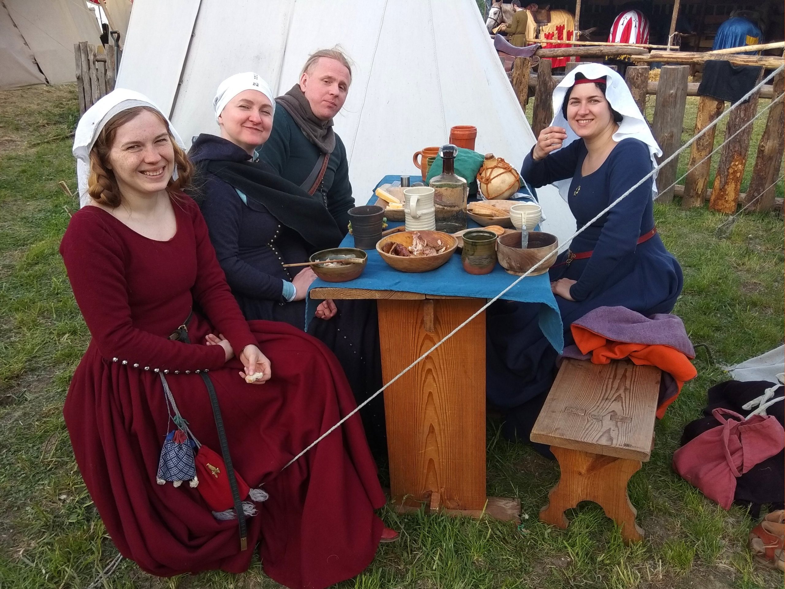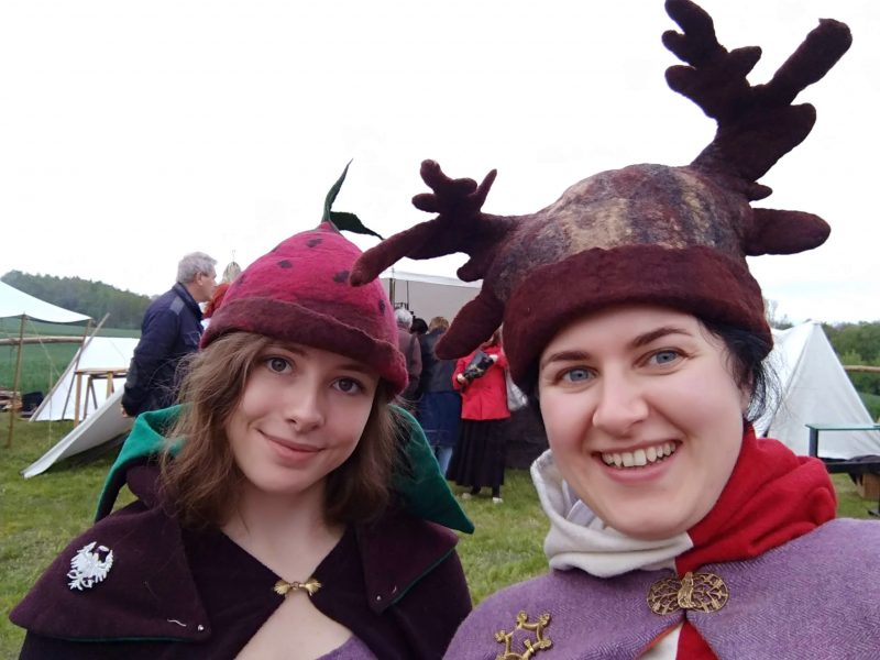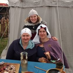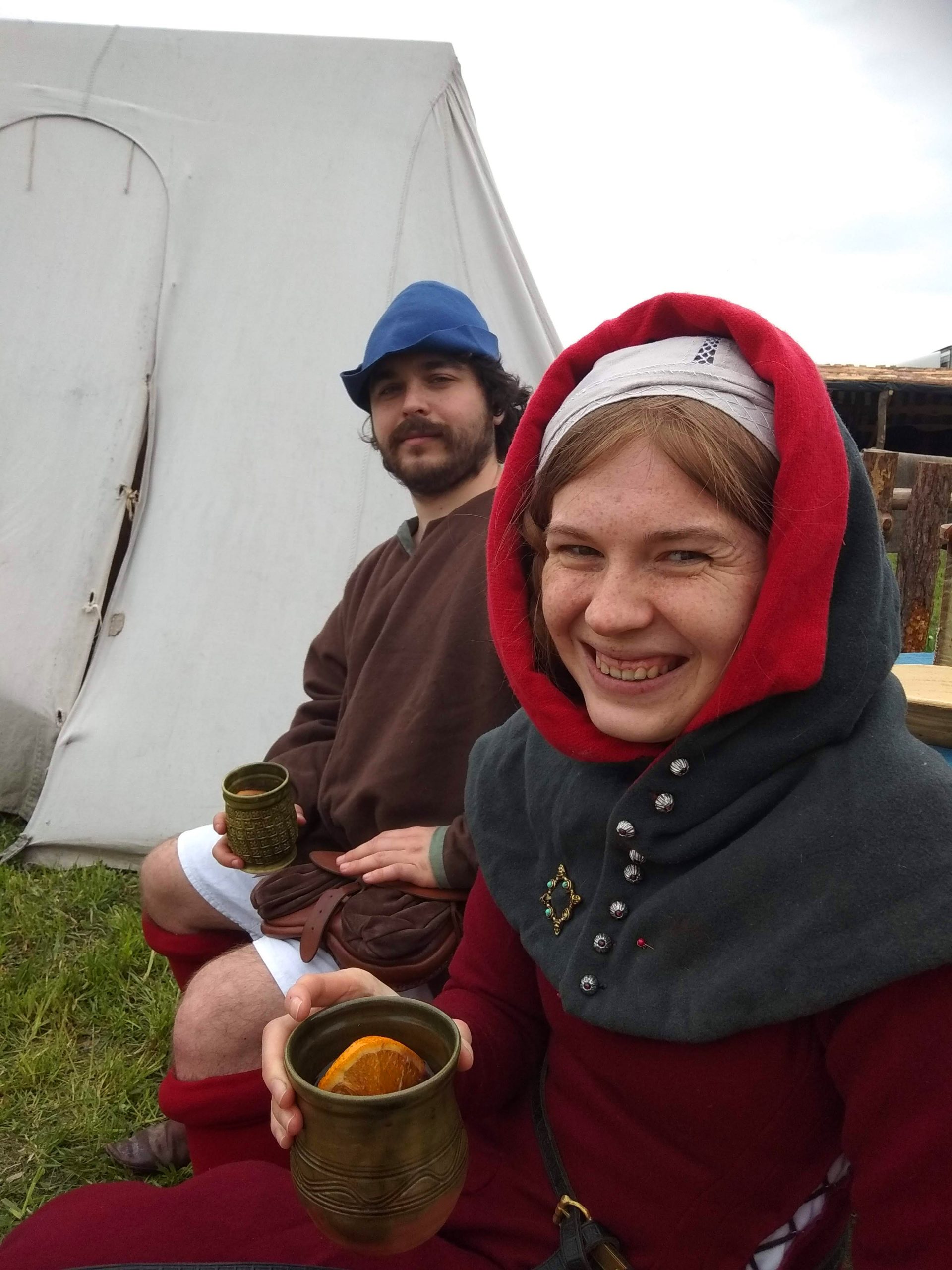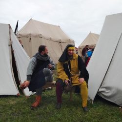 Niestety im bliżej wieczora tym mniej ludzi zostawało na turnieju. Dużo naszych towarzyszy wystraszyło się zimna i wiatru i uciekło chyżo w cieplejsze rejony. Jednak nie my, my dzielnie zostałyśmy, marznąc…. Bardzo marznąc. Bo to lubimy… bo to jest to co lubimy robić w wolnym czasie.. marznąć w gryzącej wełnie…. Bo było zimnno. Ponownie ciepły kąt i wesołe towarzystwo znalazłyśmy w kramie Marchewowym, gdzie się ogrzałyśmy częstowane zacnymi trunkami z dalekich krain… kiedyś ktoś napisze pieśń o kawowo- słono-karmelowym trunku, który skradł wężycowe serca…. Przybył też posłaniec z zacnymi plackami włoskimi, więc i głodne nie byłyśmy. W końcu podziękowałyśmy za gościnę i dałyśmy się porwać gadziemu zewowi -> czyli ciepłemu ognisku u Smoczej Kompanii. A tam już zostałyśmy do rana, wśród śmiechów i historii opowiadanych przez zacnych kompanów. Nad ranem skowronki już nas usypiały, więc trza było wracać do namiotu, przespać chodź parę godzin przed czekającą nas podróżą do domu….
