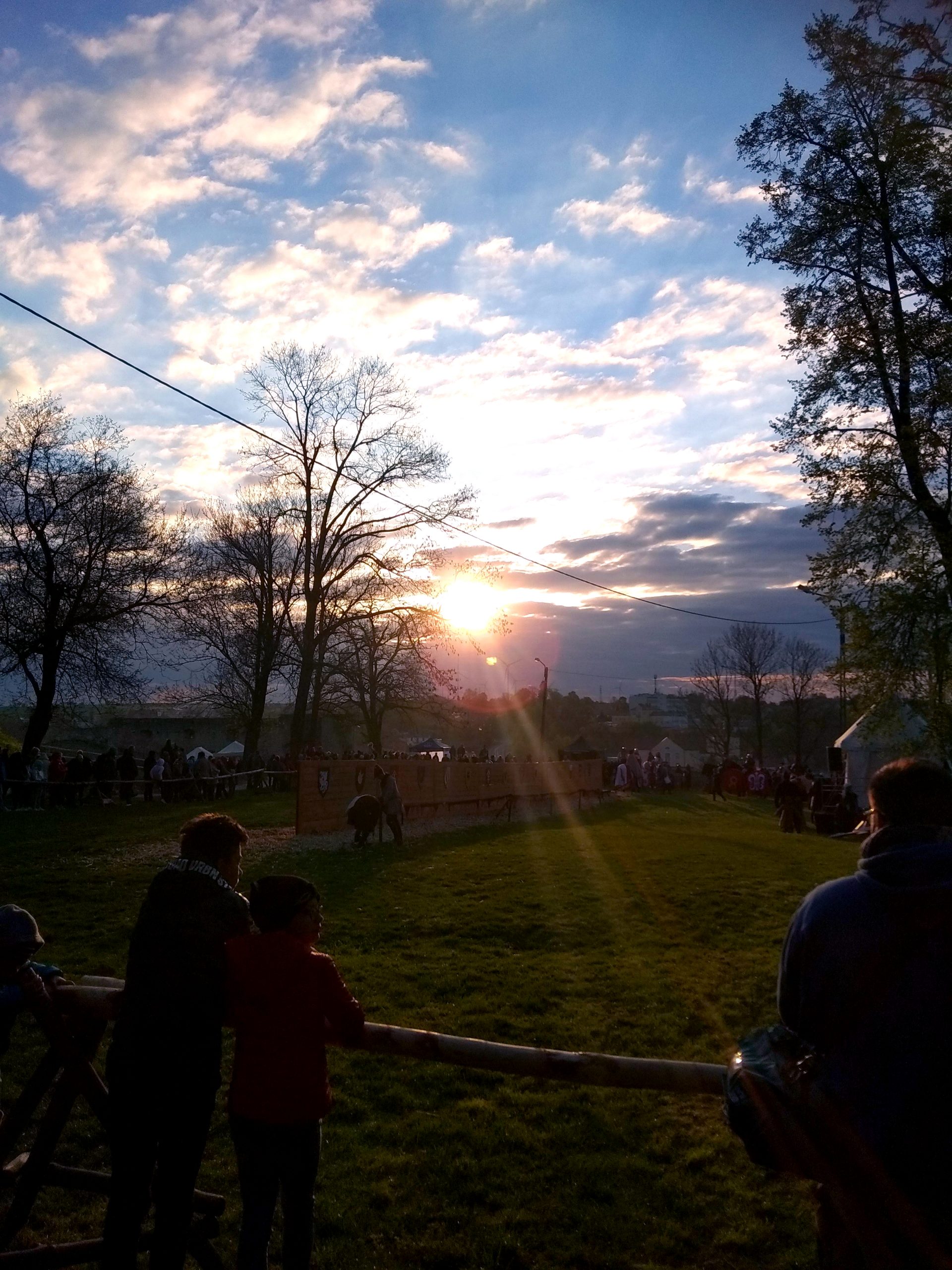 Po wszystkich występach i atrakcjach, a także wymarznięciu w czasie oglądania potyczek rycerzy i ich pocztów… wieczór był srogi. Wspominaliśmy już że było zimno? Alkoholu było dużo, noc zimna i ciemna, ale nie była pełna strachów, bo ognisko było wielkie i buchało jak szalone! Przy ognisku śpiewy i rozmowy, uszczerbki na zdrowiu, tańce i iście turniejowy klimat! Wino się lało, nogi się rwały do tańca (przynajmniej tym którzy ich nie uszkodzili) i tym sposobem, nie wiadomo kiedy minęła noc.