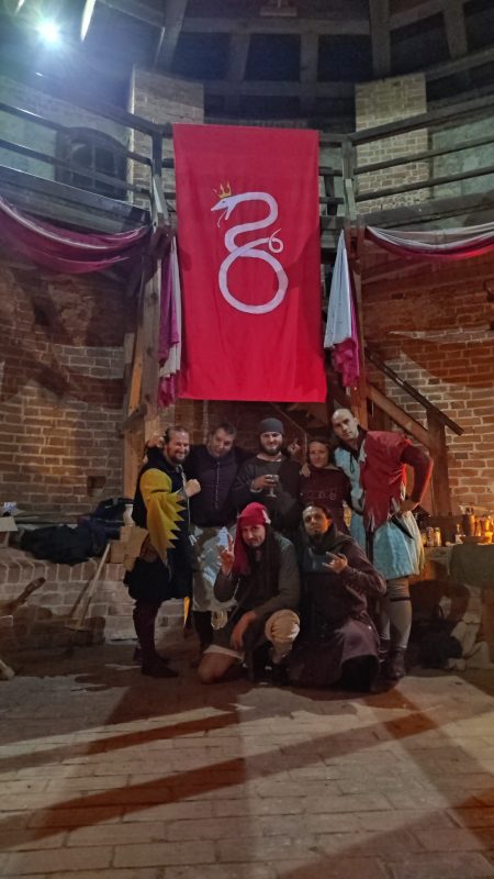 A to wcale nie był koniec atrakcji tego dnia, bo czekała jeszcze na nas karczma! I to jaka! Wieżę przystroiliśmy w girlandę i ogromny sztandar, a na stołach znalazły się: ciastka z bractwowym Wężykiem, tarty, kiełbaski, sery, owoce, pasztety i całe morze trunków do zakupu u naszego uczynnego karczmarza Kafara oraz jego stażystki Uruka. A płacić za to wszystko można było półgroszami siemowickimi oraz prawdziwymi samorodkami złota… 😉